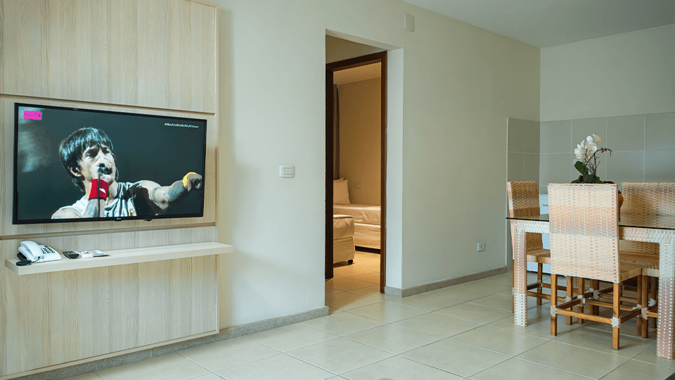 Vivencie o aconchego e conforto da Suíte Family. Com todas as vantagens de uma localização tranquila, familiar, a categoria Family possui 70 m² distribuídos em 02 quartos, 01 banheiro social, sala, 02 TV's, varanda com rede, além de vista para piscina e/ou jardim. A suíte proporciona toda comodidade e praticidade para sua família, pois está localizada próxima a piscina (adulto/infantil), bar, Circuito Adventure, teatro e recepção do Check out. Ideal para famílias e grupos de amigos, acomoda até 06 pessoas, sendo: 05 adultos e 01 criança; ou 04 adultos e 02 crianças ou 03 adultos e 02 crianças; ou 02 adultos e 02 crianças.