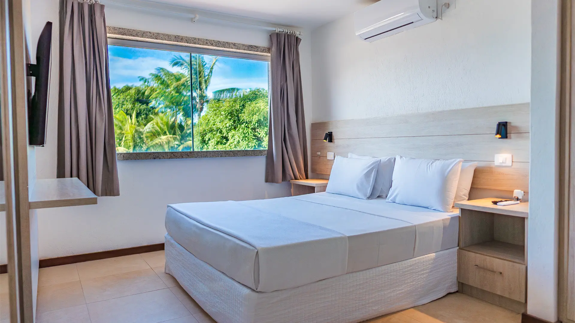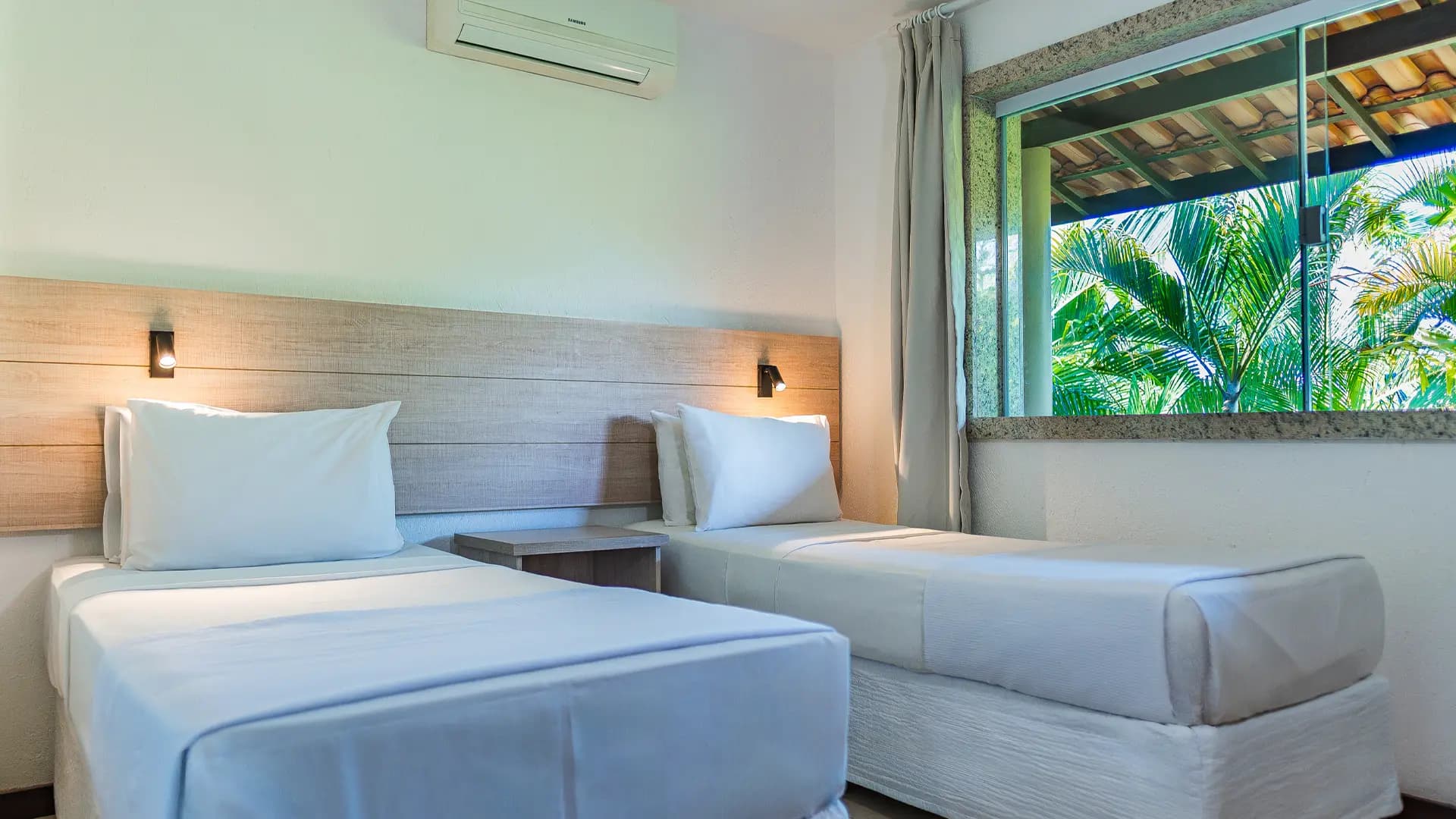 Desfrute da exclusividade da Suíte Topázio. As acomodações são amplas e oferecem tudo o que sua família deseja para curtir férias inesquecíveis, com localização única, bar e piscina exclusivos. A categoria foi desenvolvida para sediar a seleção da Suíça, durante a Copa de 2014, além de proporcionar toda tranquilidade, conforto e contato com a natureza. Com 90 m² distribuídos em 02 quartos, 01 banheiro social, sala com TV, varanda com rede, vista piscina e/ou jardim. Acomoda até 06 pessoas, sendo: 05 adultos e 01 criança ou 04 adultos e 02 crianças ou 03 adultos e 02 crianças ou 02 adultos e 02 crianças.